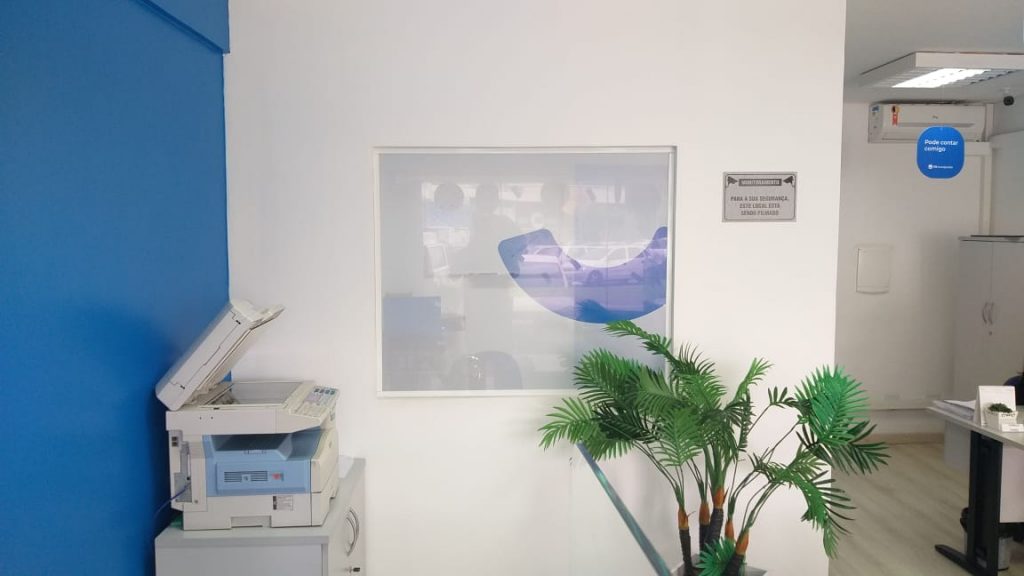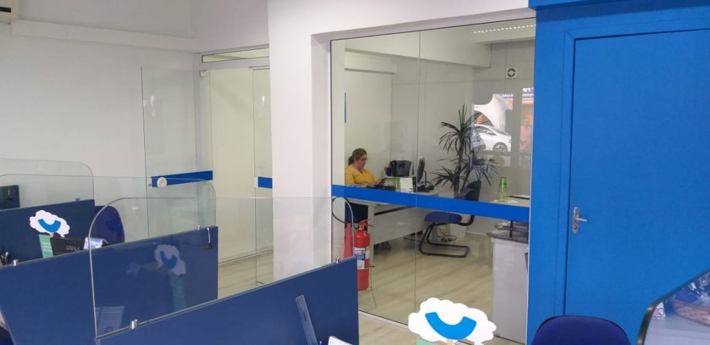 A montagem das fachadas foi utilizado ACM com estrutura em metalon galvanizado e iluminação interna com LEDs além de acrílico com adesivo oracal azul, logo em adesivo recorte. Placa bandeira em estrutura com acrílico e iluminação interna com LEDs Comunicação interna com letras caixa em PVC expandido, adesivo perfurado