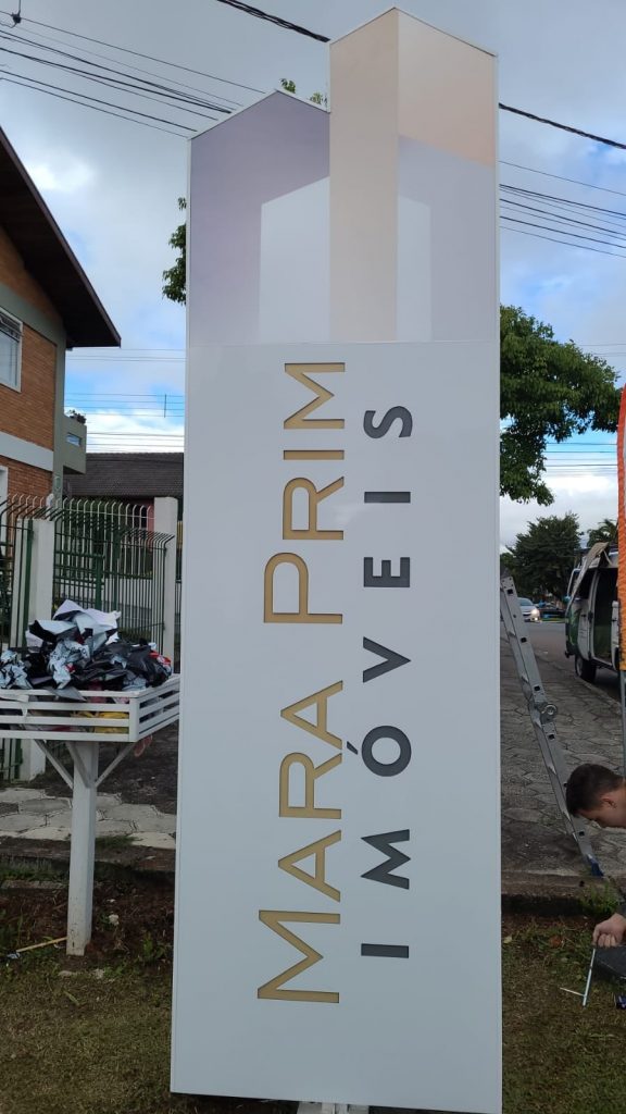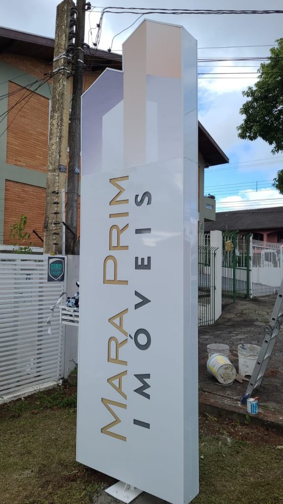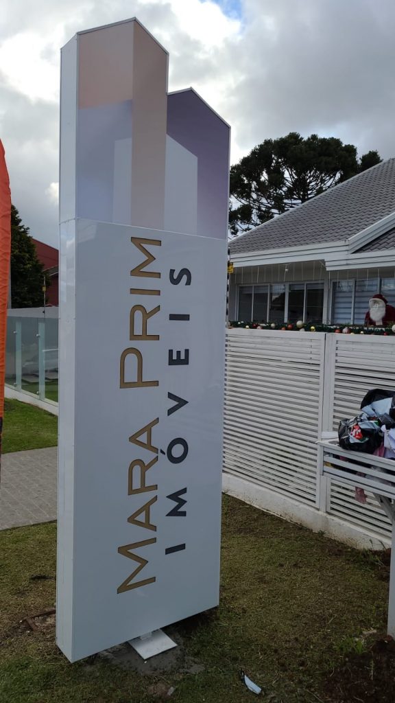 O totem projetado para a Mara Prim imóveis conta com uma estrutura metálica + ACM vazado, o acabamento com acrílico interno e iluminação em LED.